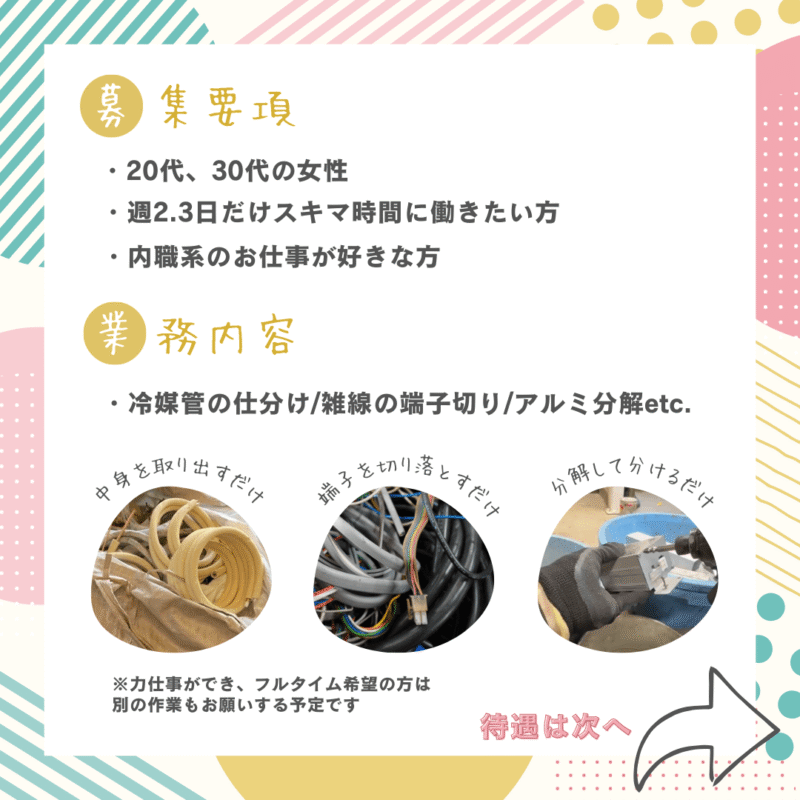 ※力仕事ができ、フルタイムで働きたい!という方には、別の作業もお願いする予定です。